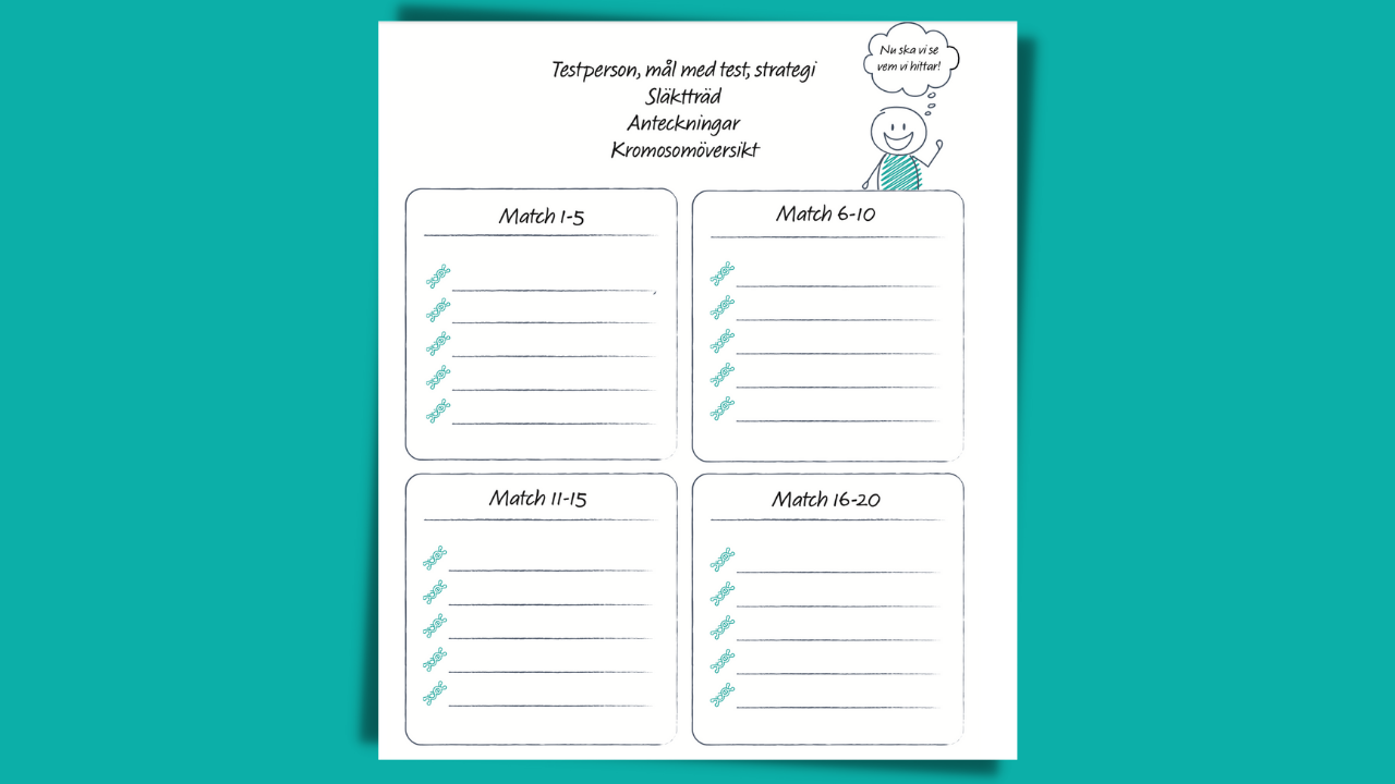 Jag jobbar väldigt gärna digitalt men när jag jobbar med mina dna-matcher vill jag gärna använda papper och penna, skriva noteringar om var en person har sina rötter, notera hur mycket dna man delar, kunna titta på släktträdet, se vilka matcher vi har gemensamt och på vilka kromosomsegment vi har träff.